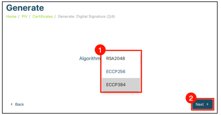 - Choose Algorithm: Pick an algorithm from the dropdown menu. For Code Signing, go with ECCP384 due to YubiKey’s ECC algorithm support.